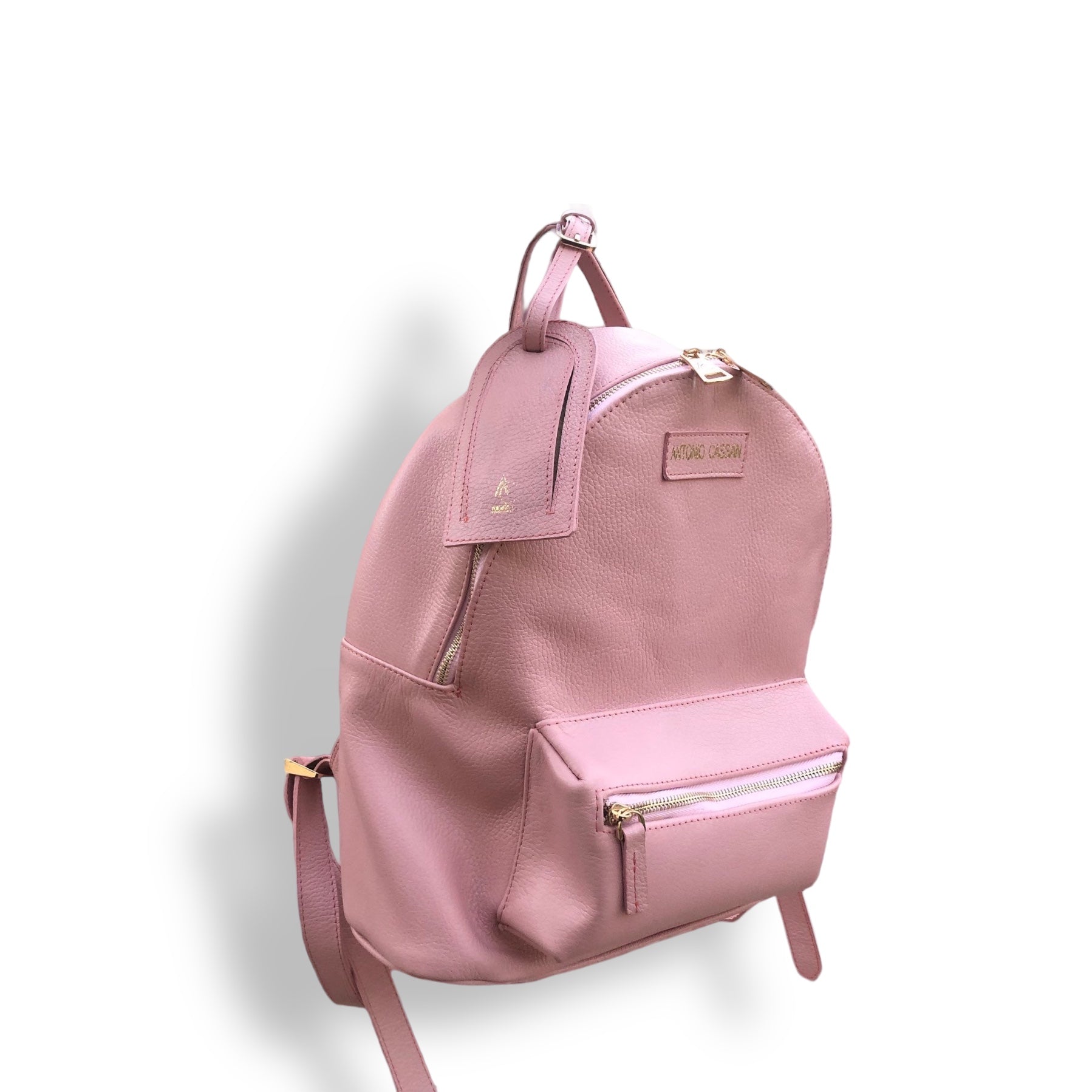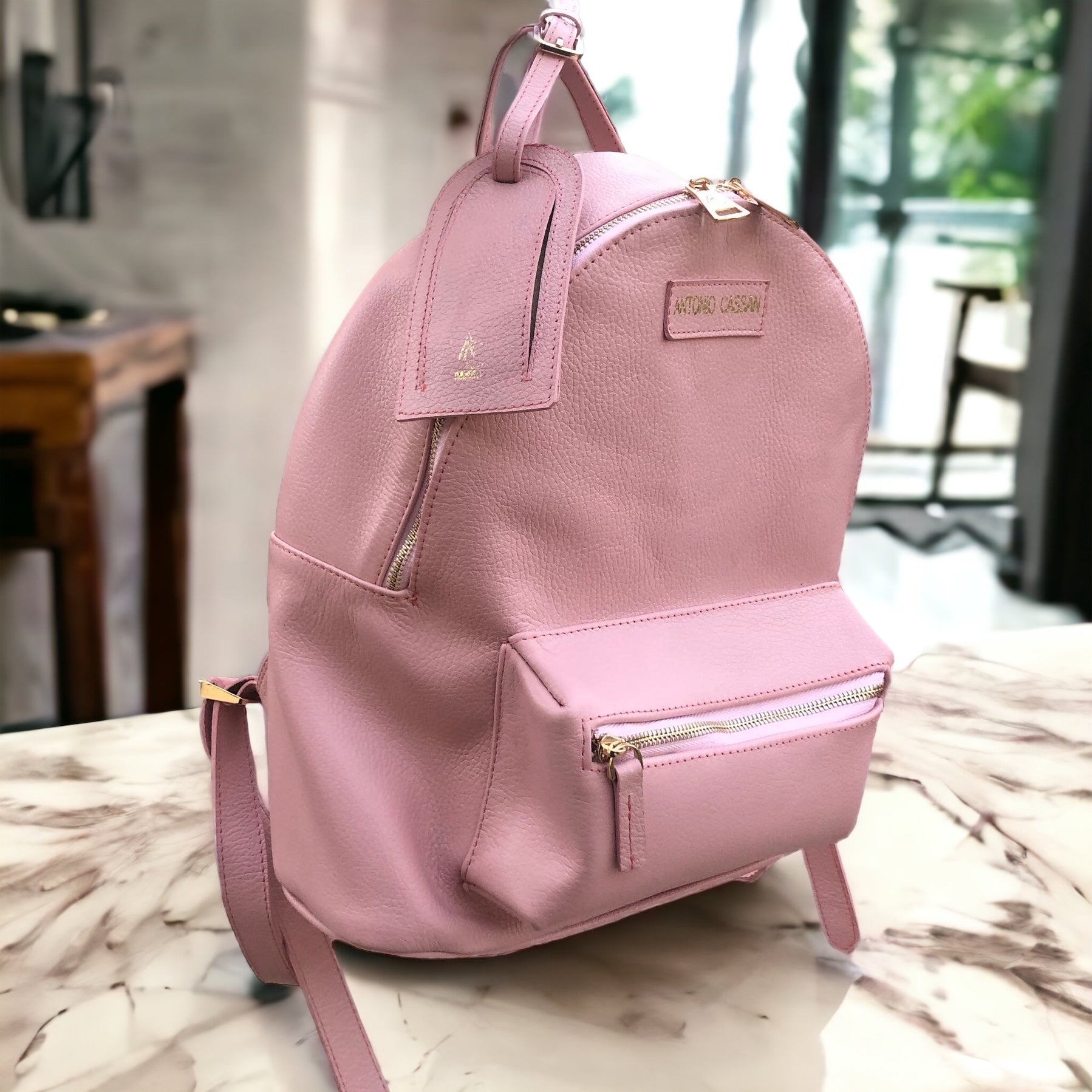 Mochila hecha 100% de piel vacuno con forro de poliéster cierres y herrajes de metal, lleva una bolsa por fuera y una interior, además incluye un tag de viaje.