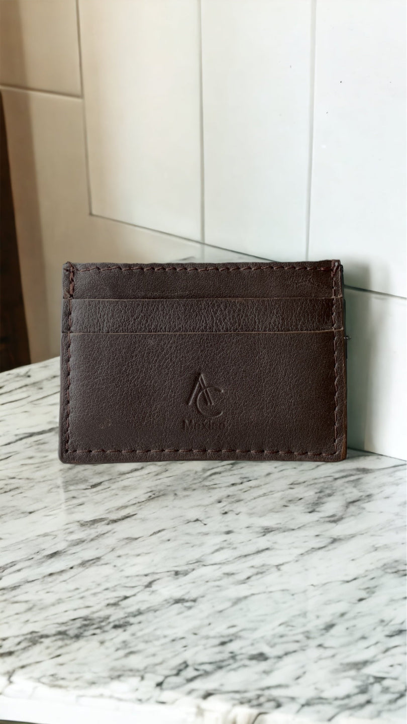 Tarjetero doble de piel color cafe granulada con forro de poliéster perfecto para los que manejan tarjetas y efectivo, cuenta con un compartimento en la parte de en medio donde puedes guardar efectivo.